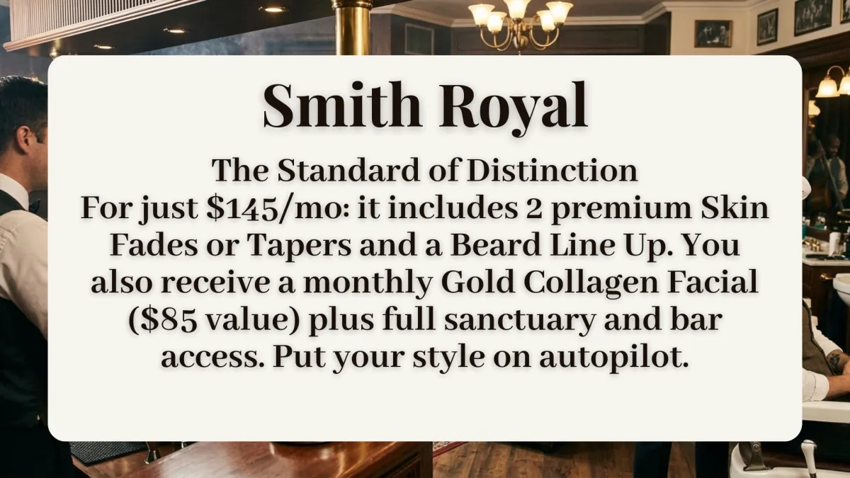 Our most exclusive luxury experience. This is a complete transformation from head to shoulders, combining the 5 Pillars of Luxury: Precision Cut, Royal Smooth Shave, Gold Collagen Mask, Hydration, and an extended Shoulder Massage. This is a statement, not just a service.